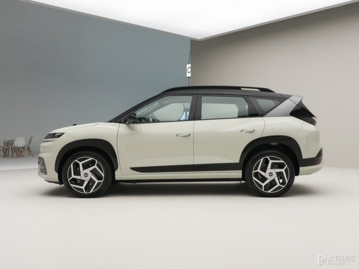 车身侧面造型较为个性运动,采用上下双色涂装,配备隐藏式门把手和20英寸花瓣样式轮毂,车顶还配有黑色行李架。车身尺寸上,新车长宽高分别为4615/1875/1675(1698)mm,轴距为2750mm。