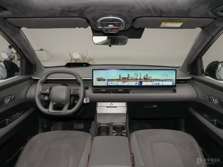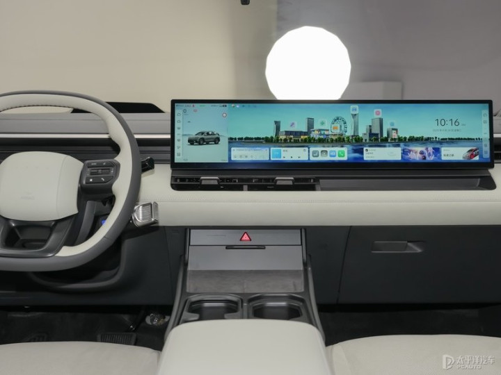 2.内饰座舱:配备27英寸一体式中控屏,应用怀挡式换挡和换挡拨片,搭载高通骁龙8295芯片;